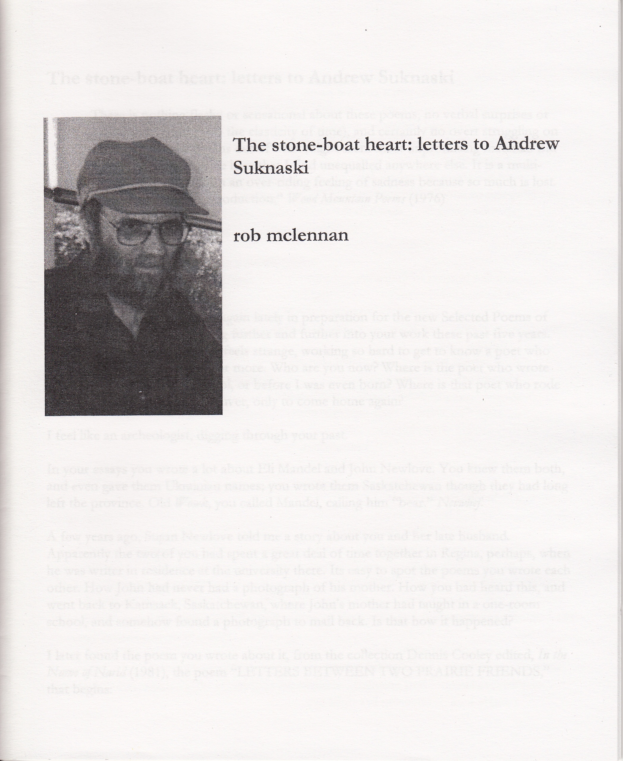 From rob mclennan’s occasional Apostrophe Press comes a chapbook of one-sided correspondence between mclennan and the late Andrew Suknaski. I have to confess my general ignorance of Suknaski’s work. I know him from occasional anthologies, and by reputation, but I have never seen his books available in used book stores and as a result have never been able to dedicate his work the time it evidently deserves. I’ve been aware of the perpetually forthcoming selected poems from mclennnan’s Chaudiere Books, but given Suknaski’s recent death I suspect that publication will find itself further delayed by a new landscape of legal complications.