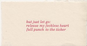 The book is 77 pages, but with barely five words, and often fewer, on many of the pages, it is a quick read. Ball is correct though, these are not simple poems, they are ‘difficult’ and ‘rewarding.’ The book demands rereading. And rereading. And rereading. It is a great joy to find a book from a practicing poet whose work you are not familiar with, but you immediately feel an affinity with. Page after page of this book is full of poems that I wish, desperately, that I’d written. The four part poem, “Eights,” one of the longest in the book at a whole thirty two lines, felt immediately familiar. It was a poem I had been trying to write, and failing to write, for years. And here it was, complete and published.