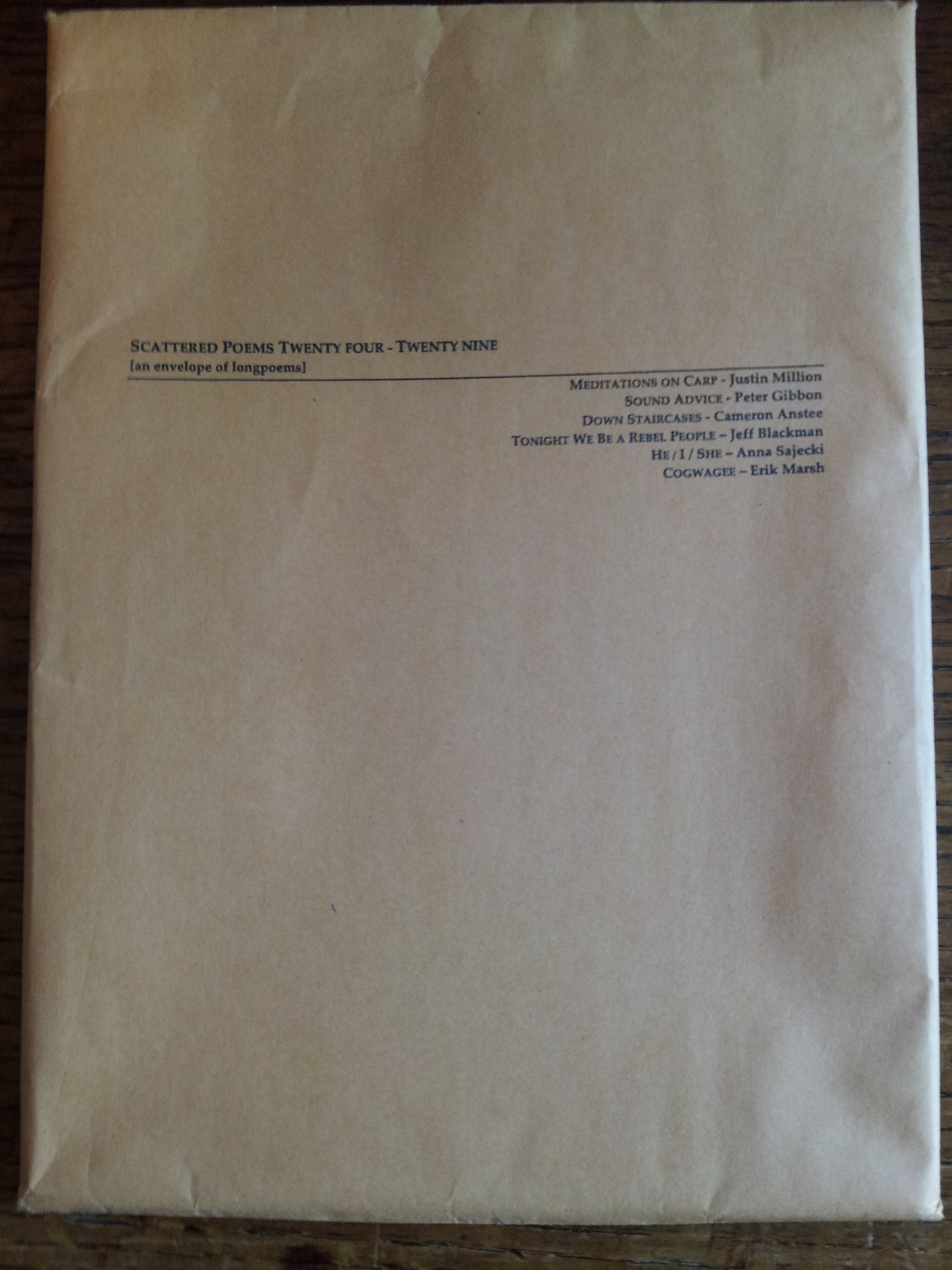 Over beers last night, Jenn, Justin Million and I discussed the “longpoem envelope”, published in June 2008 for an installment of the Ottawa small press book fair. Officially published as SCATTERED POEMS TWENTY FOUR-TWENTY NINE [an envelope of longpoems], the set was comprised of six chapbooks bundled together in a plain envelope.