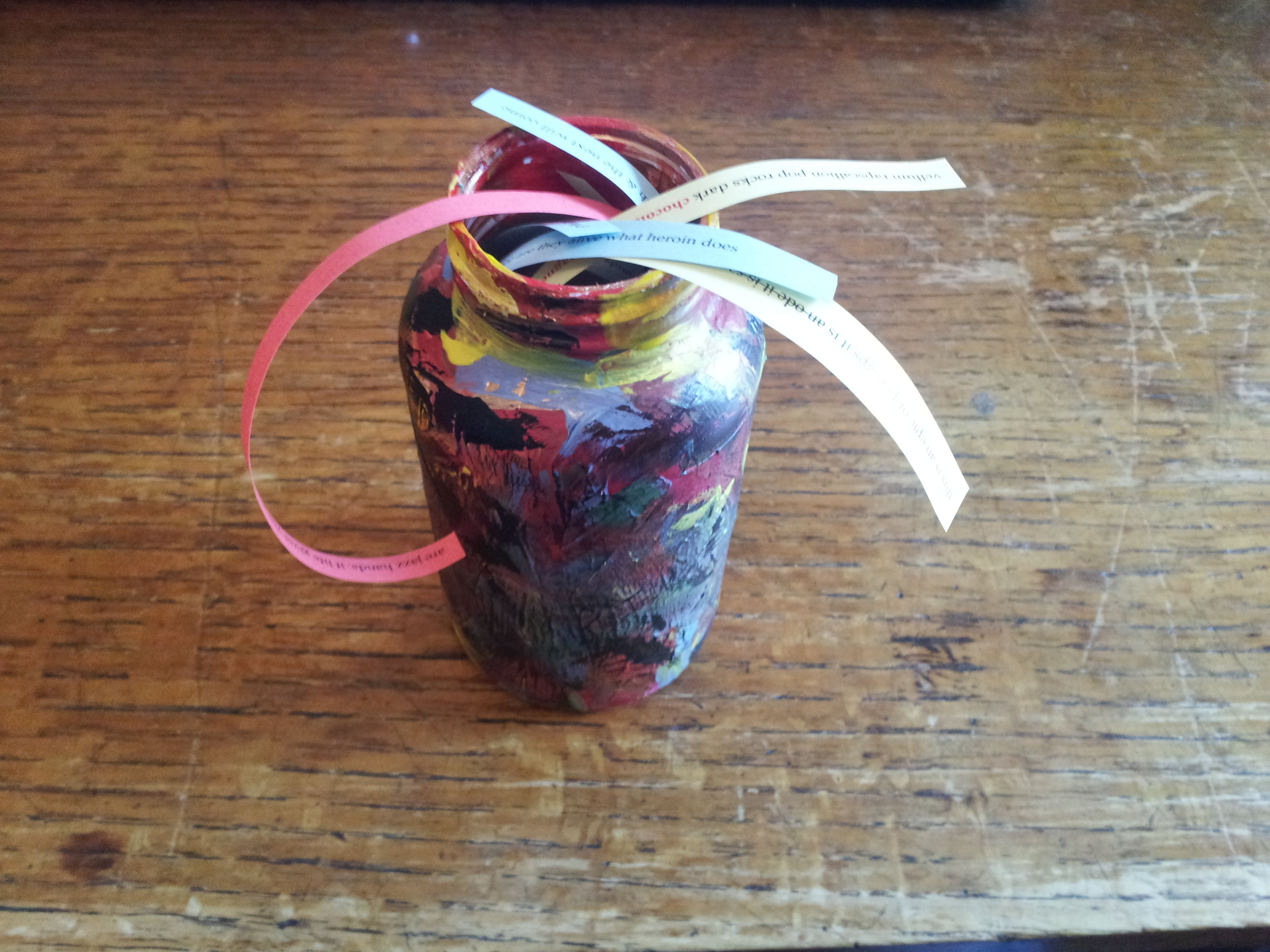 I bought far too much at the fair to discuss it all here, but I’ll wrap up with an item from Amanda Earl. At the bywords/AngelHousePress table, Amanda was giving away colourful, handpainted bottles stuffed with individual lines that call on the reader to construct poems. Information from Amanda: “Poemeceuticals in an edition of 10, all given away during the fair, another ephemeral production of Le Temps des Cerises, an imprint of AngelHousePress.” It is a clever, friendly gesture that makes the reader aware of their own creative participation in the entire process. I don’t know how many of these Amanda brought along, but I’m thrilled to have one at home. Playful and ambitious, exactly as Ottawa has come to expect from Amanda. Now, to figure out how it might fit on a bookshelf…