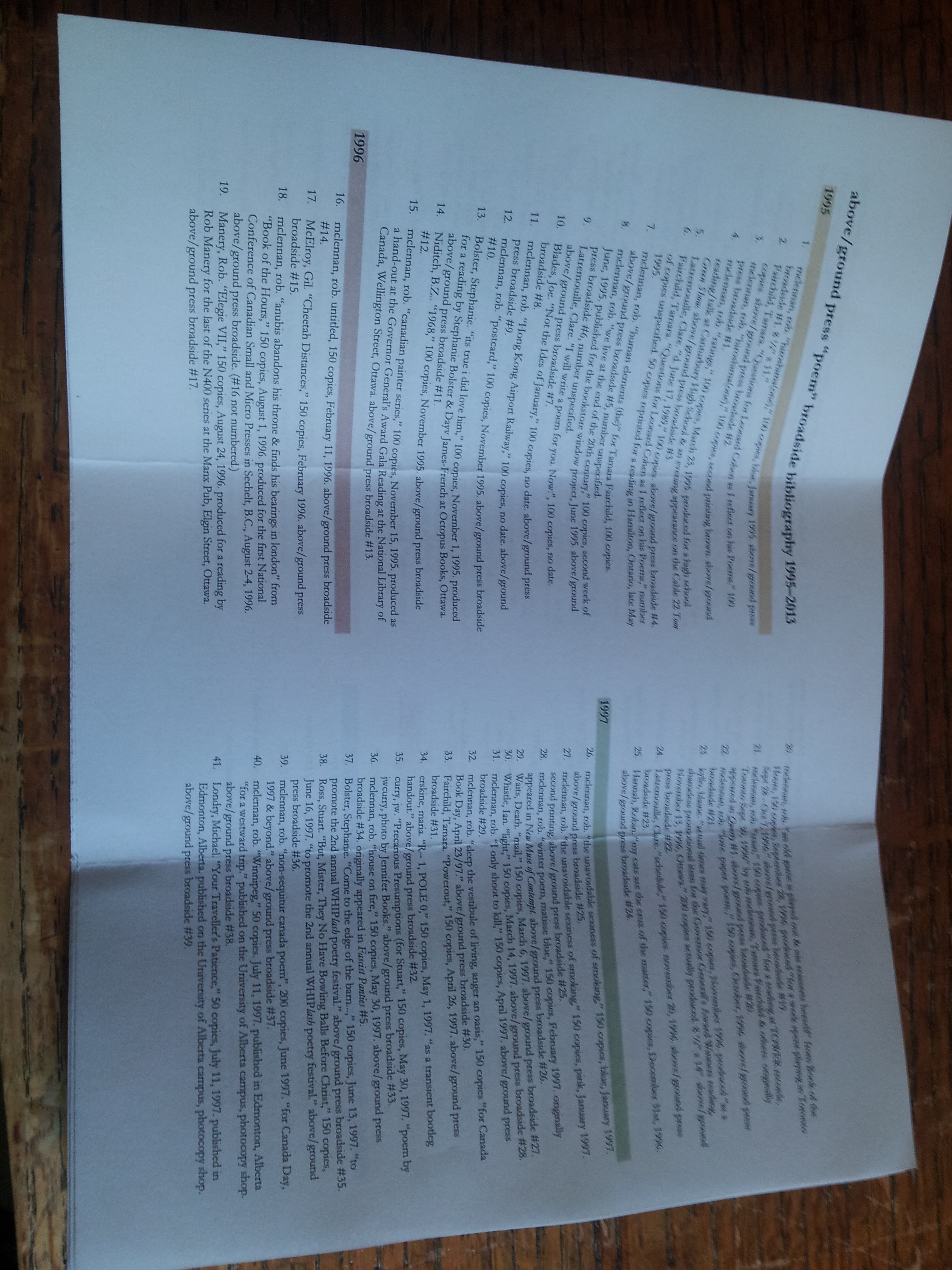 The set includes 31 “poem” broadsides, and touches on the huge range of aesthetic and poetic interests rob has nurtured over twenty years. Poems from Marilyn Irwin, Jamie Bradley, Pearl Pirie, Sandra Ridley, Gwendolyn Guth and others show some of the Ottawa community represented, while poems from Stephanie Bolster, derek beaulieu, George Bowering, Phil Hall, Gil McElroy and others show how above/ground managed to reach beyond the city.