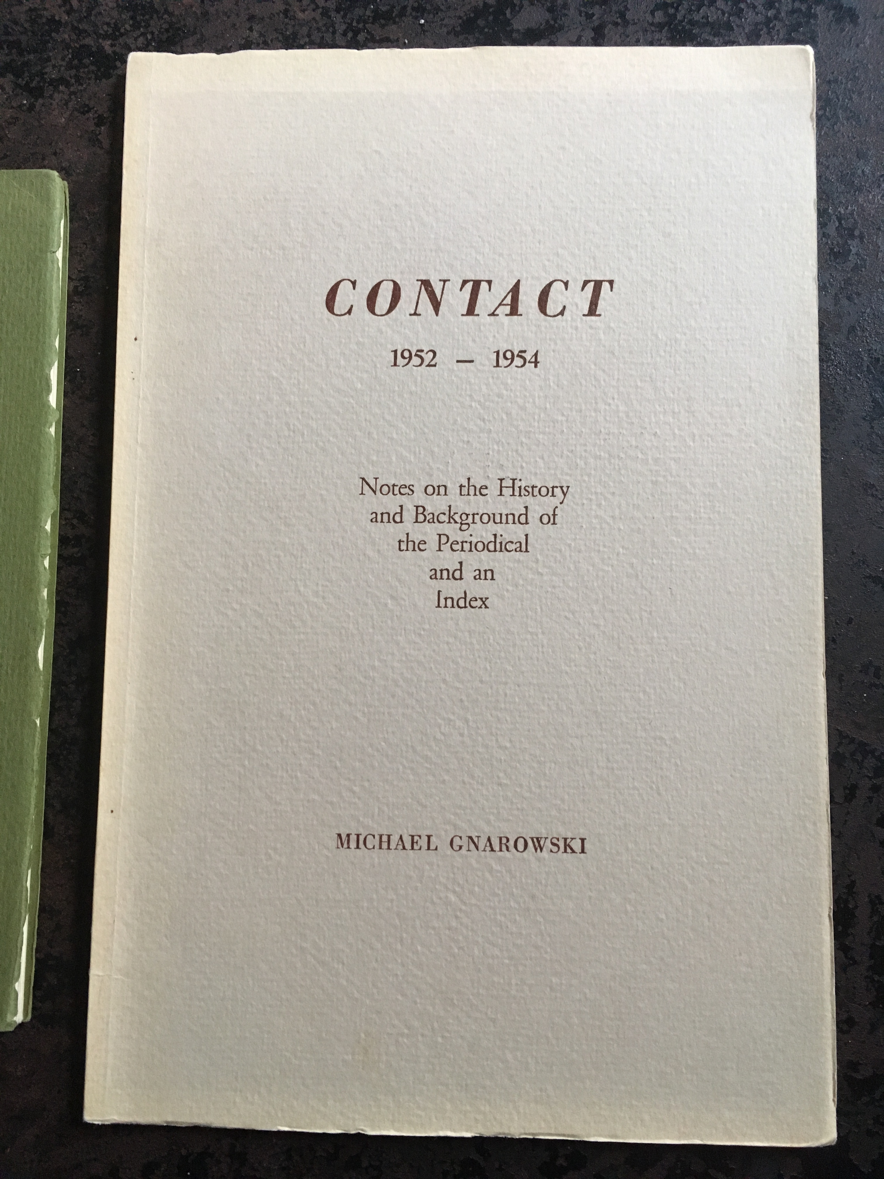 Michael Gnarowski’s index of Souster’s Contact Magazine. Contact released its first issue in January 1952, three months before Cerberus would appear as the first title under Contact Press.