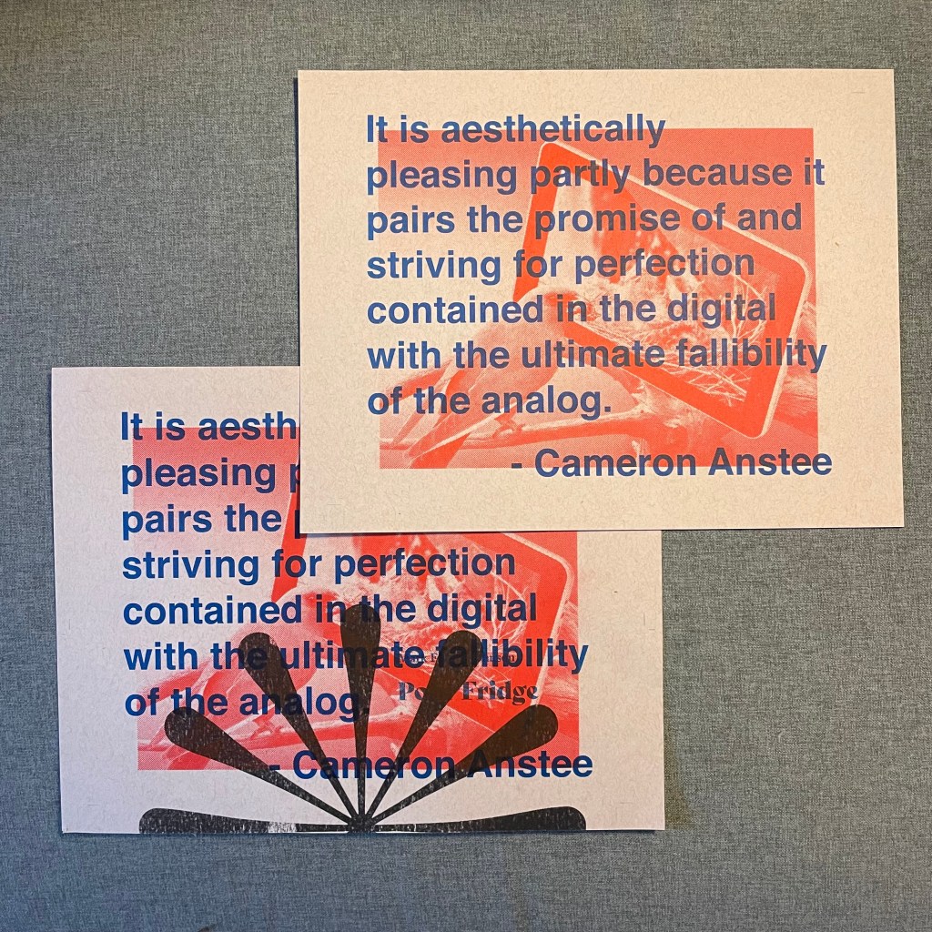 And last but not least, I recently finished writing an essay (or at least finished writing a draft of an essay…) about Jessica Bebenek‘s amazing k2tog project, an essay that touched on risograph printing among many other things. Jessica then pulled a line from the essay and used it as demo text in a risograph workshop she was running, meaning that I now have a stack of very cool broadsides printed on a mix of off cuts at the riso studio of Concordia’s Centre for Expanded Poetics: