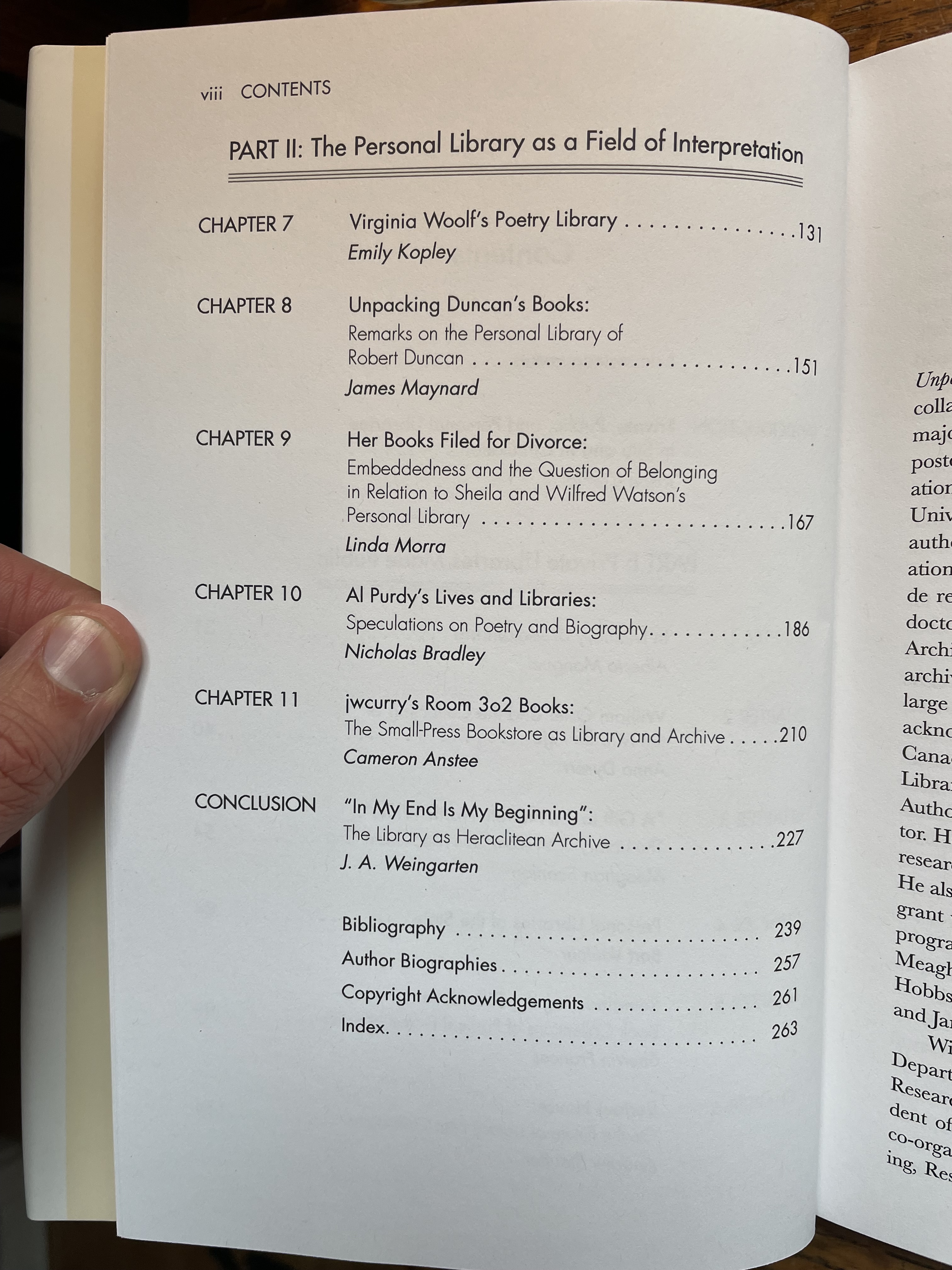 I am also delighted to say that some of the work in my dissertation has finally been published in print (reminder that you can read the whole thing for free here if you like). I contributed a chapter to Unpacking the Personal Library: The Public and Private Life of Books, edited by Jason Camlot and J.A. Weingarten. I am excited not only to see my research on jwcurry published, but also to be in such fine company (Alberto Manguel! Sherrin Frances! Linda Morra!). Thanks Jason and Jeff!