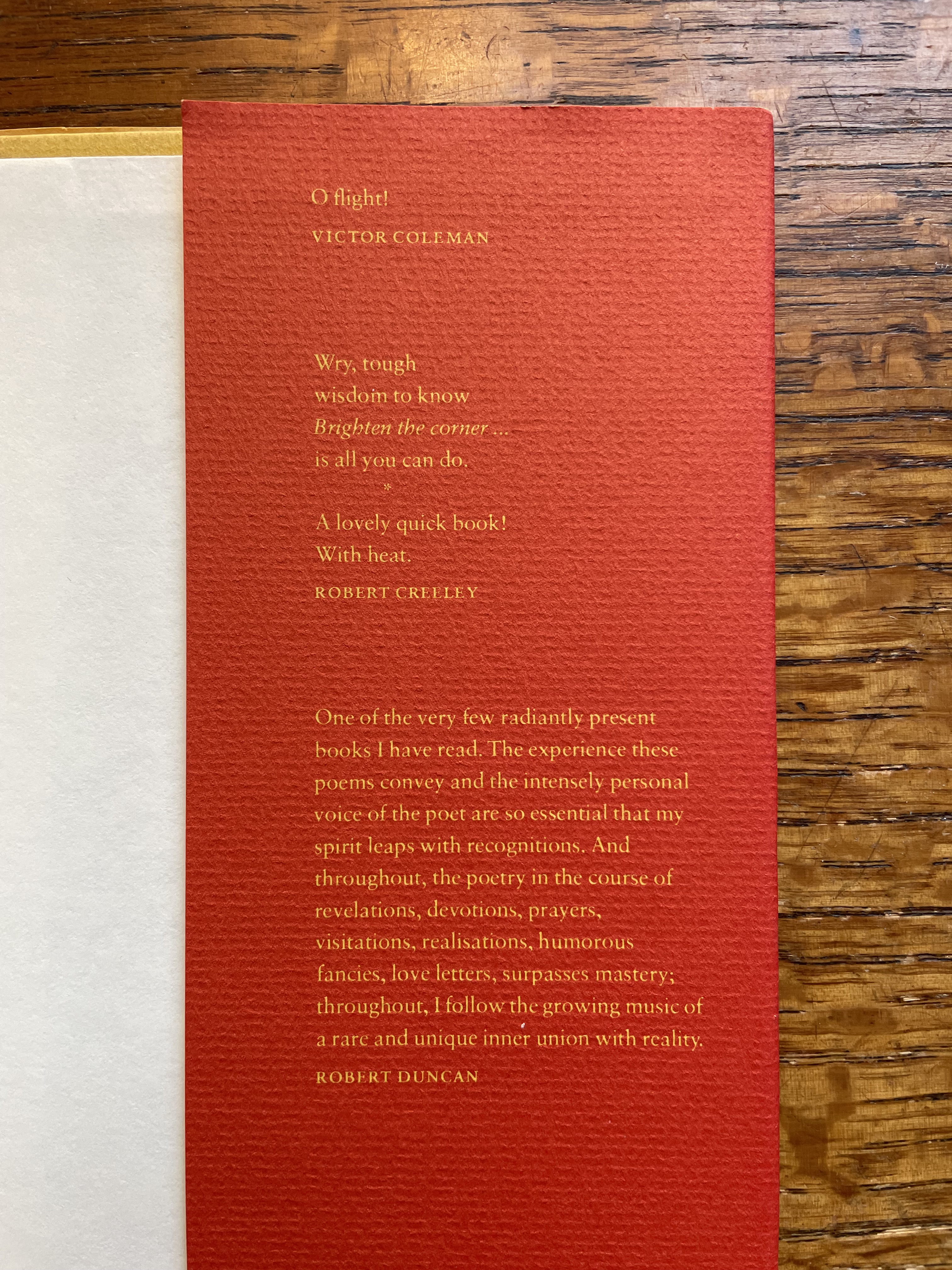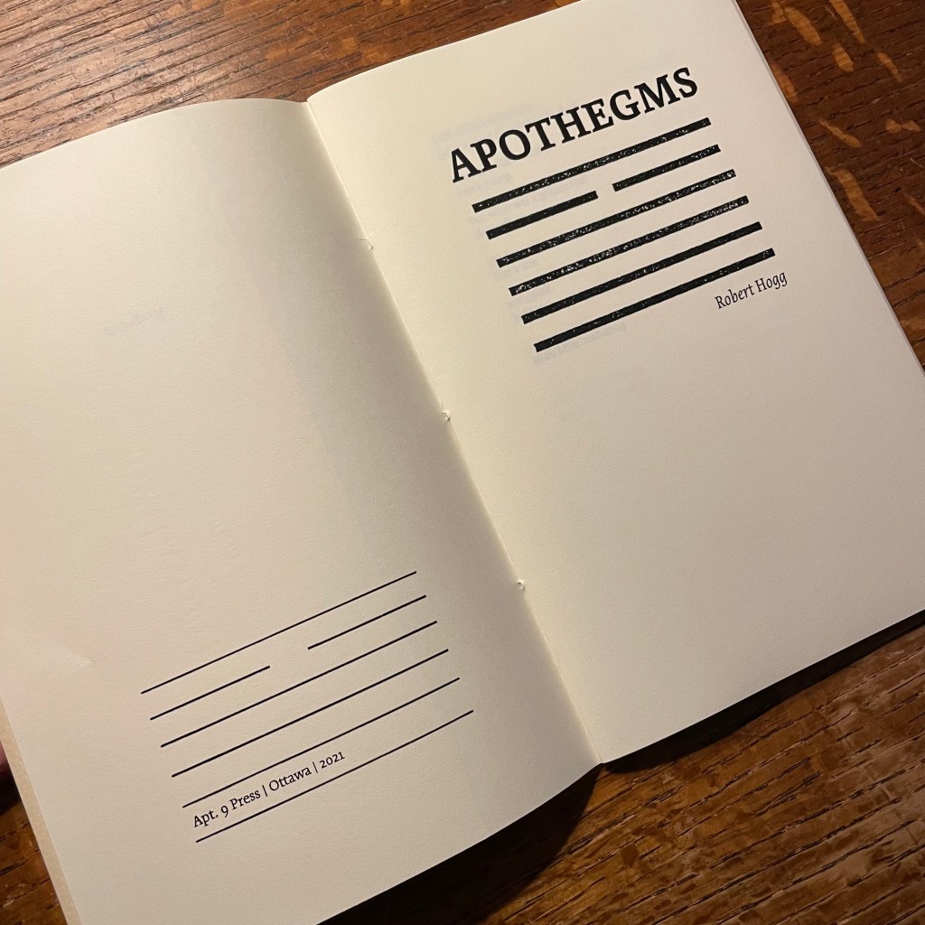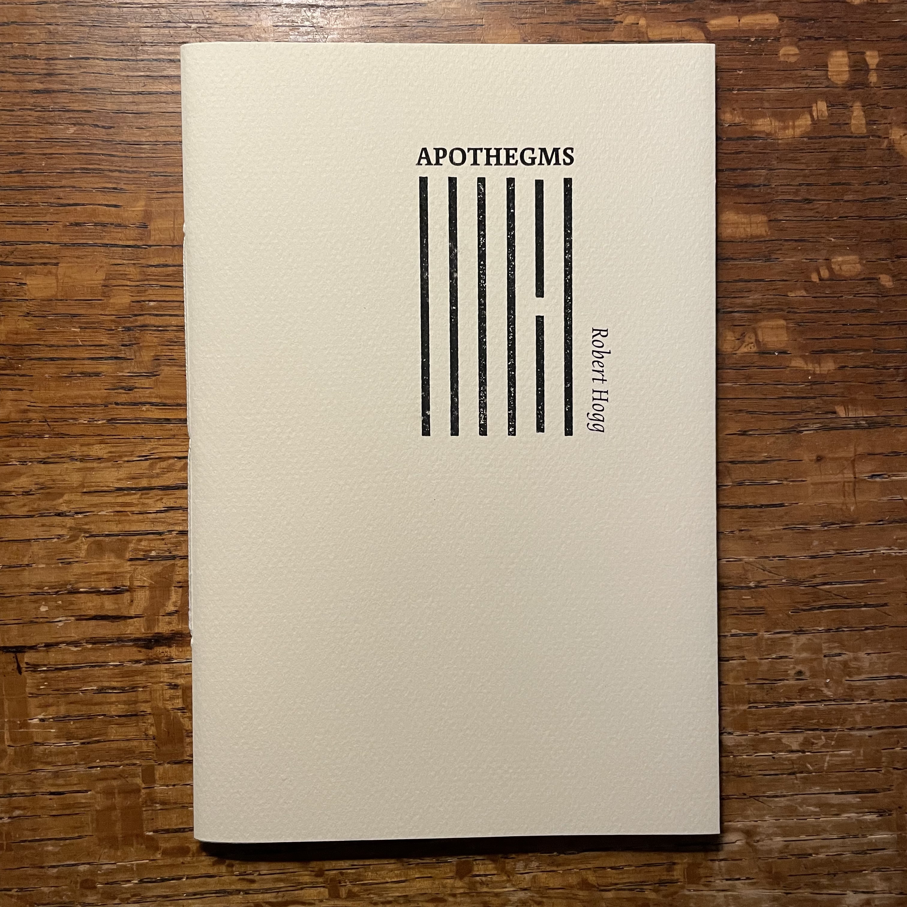 Publishing Apothegms was one of the great privileges of my life, small press or otherwise. The poems are, of course, excellent, full of humour and insight and carried by his reliable poetic instincts. But it was also the experience working with Bob. He was so generous and open throughout the process, and patient with me, and I think that we made a truly great book together. I’ve put up a PDF of the whole thing for free here if you’re interested.