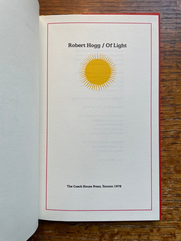 His five trade books were published from 1966 to 1993, a book every 6 or 7 years. A pace influenced, I am sure, by his research, and his teaching, and his farming, but also a graceful pace. Each book in his bibliography is unique, and none overstay their welcome. They were published by Oyez, and Coach House, and Black Moss, and ECW (with an edited collection of Confederation-era poetic theory from Talon for good measure), all excellent presses that did beautiful production work on the books. The blurbs on Of Light make clear the esteem in which he was held by his fellow poets—none other than Victor Coleman, Robert Creeley, and Robert Duncan sing his praises.