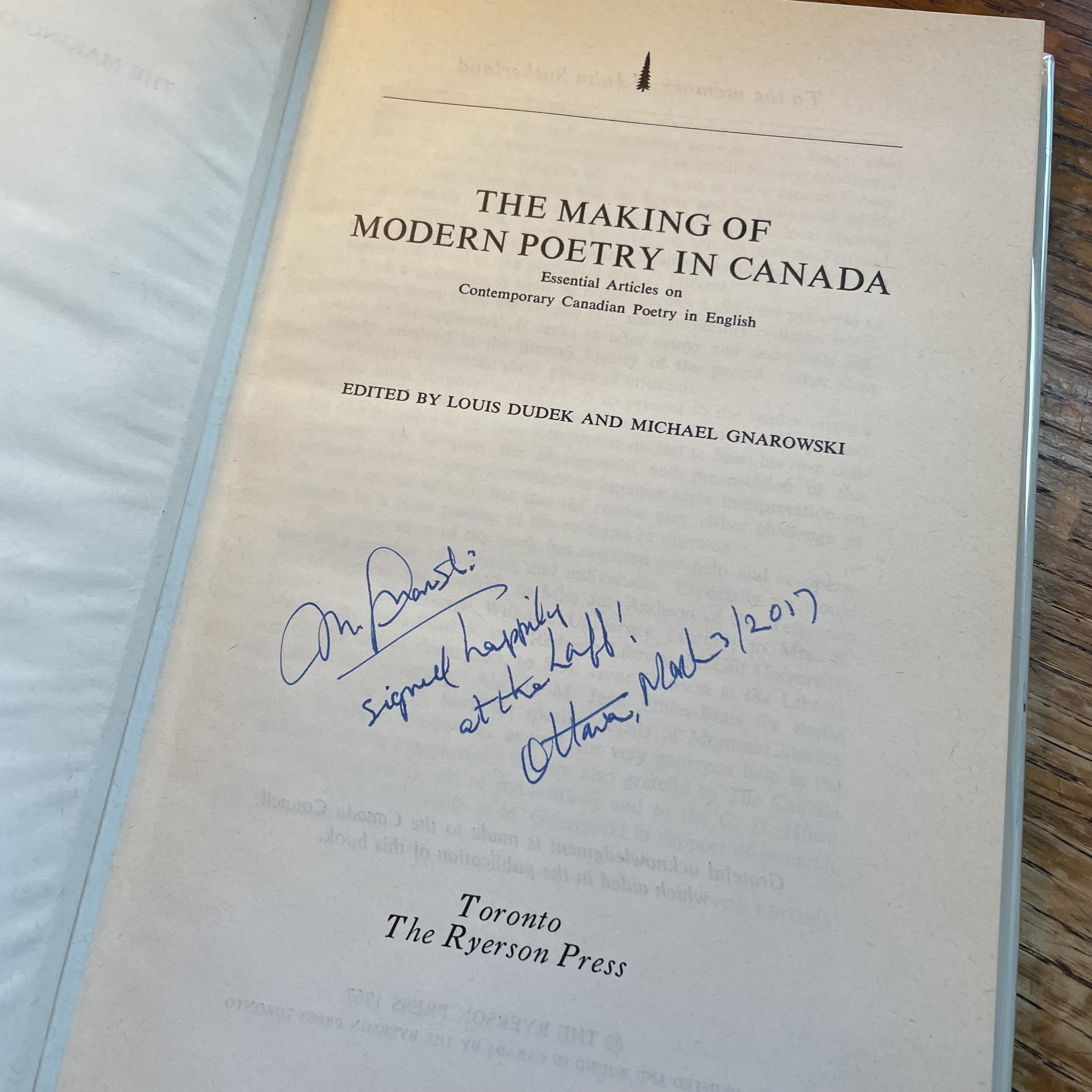We met—Collett, Michael, the editors at In/Words—in a small food court beneath residence commons, and we just listened to him. He told us stories of his life in poetry, his friends, what he thought of it all. (We had no smartphones in 2007 so I have no photo.) A few years later, he was a reader on my M.A. Research Project and I remember my nerves before sitting in that small room in Dunton Tower across from him. I saw him occasionally after, always through Collett. The most recent meeting was March 2017—still no photo, but I can date this one thanks to a kind inscription on a book—at the Lafayette in Ottawa’s Byward Market. It was Collett and Michael, again, as always, with a table or two of current students and former students. Ostensibly we were there to discuss future plans—some scheme to publish or republish a book, or to track someone or something down—but the more important work was putting Michael in a room with some kids just coming up. I remember it, and hope they will too.