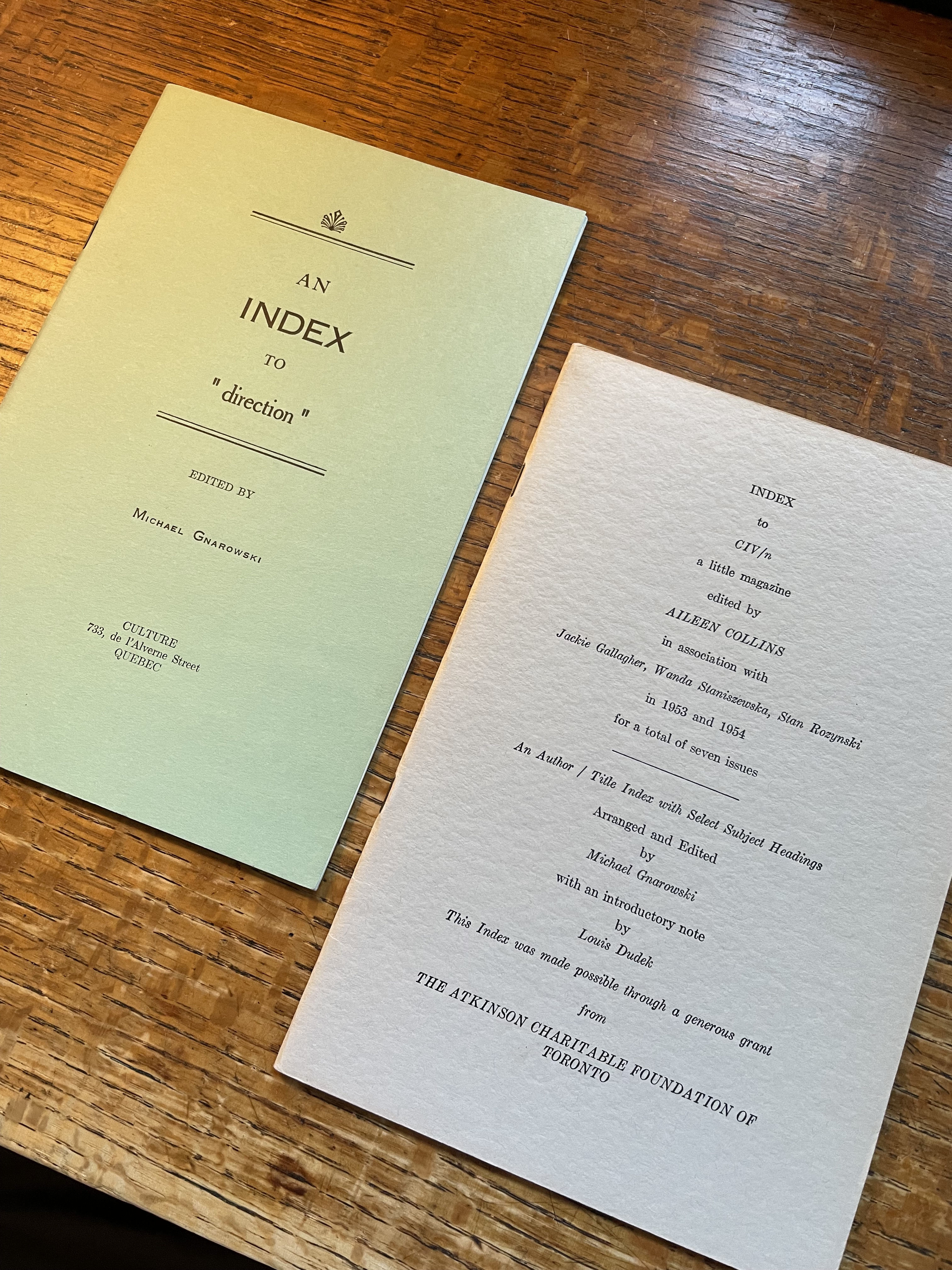 Yes Michael was a poet and editor, but when I turn to my shelves today I find that his indexes and bibliographies occupy the most space—indexes of magazines like CIV/n, and Direction, and Contact, and of Contact Press, and of English Canadian literature broadly. I have a little hardcover reference book he published with M&S in 1973, A Concise Bibliography of English-Canadian Literature, which was adapted from his doctoral dissertation.